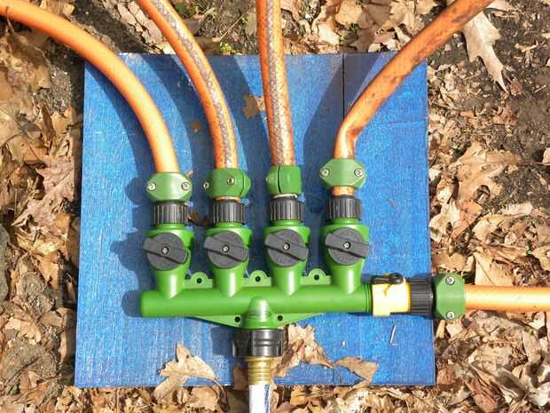 He modificado un colector de manguera de jardín con un toque extra en el paso a través en el extremo para conseguir 5 salidas con grifos para equilibrar la salida.