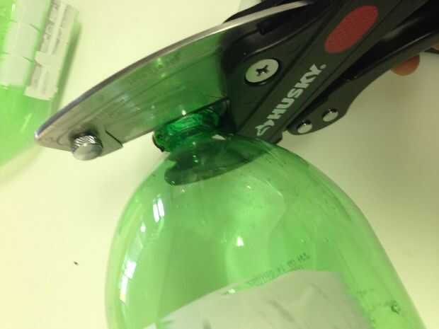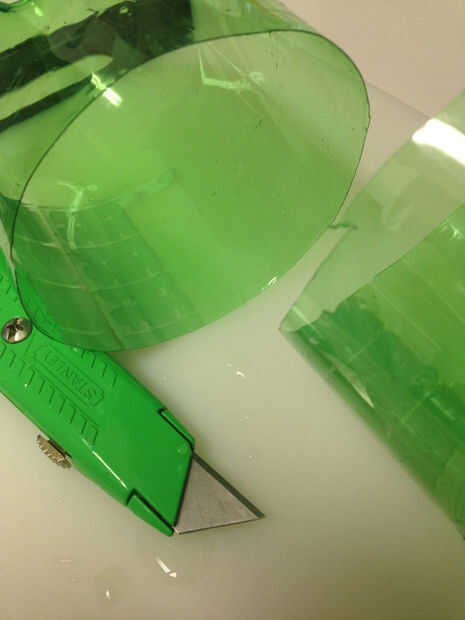 2. Utilizando una herramienta de corte de algún tipo (usaba un cuchillo pero sería más eficaz una tronzadora) cortan los fondos de las botellas. Desea guardar la mayor parte de la zona más ancha de las botellas para las plantas que crecen en.