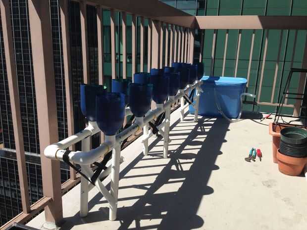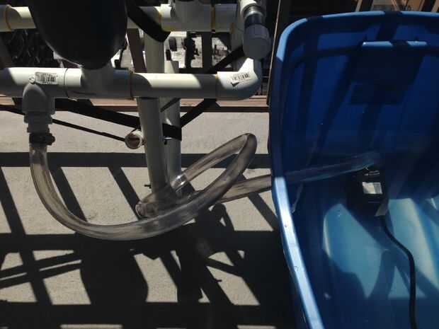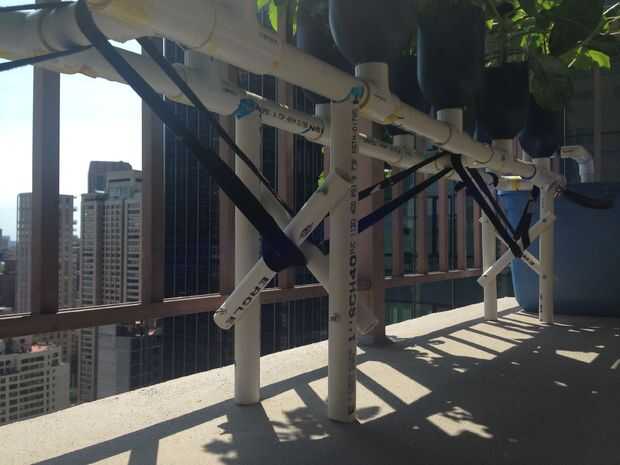 Aquí es donde mis fotos Haz un poco de pocos y lejos entre (mis disculpas). Vas a querer dar su sistema algunas piernas fuertes para soportar el peso del agua, las plantas y del viento. Usé algunos extra tubería de PVC y algunos tornillos y tuercas que tuve que poner todo para dar mi sistema algo para estar de pie. Usted tiene que asegurarse de que las piernas estén lo suficientemente altas para que el niple de llenado de rosca es mayor que el agujero que pones en tu depósito, para la tubería de agua. Usted quiere la gravedad para poder tirar toda el agua hacia atrás por el sistema cuando la bomba está apagada.
