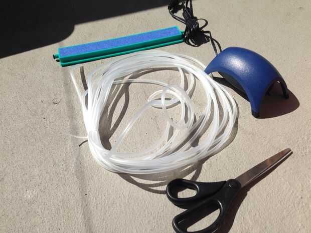 - Tener listo el aireador y la bomba de aire. Desea mantener el agua aireado, así que ponte en la piedra de aire junto con la bomba y pasar el tubo de aire y cable de alimentación a través del orificio que hiciste anteriormente en el paso 3.
