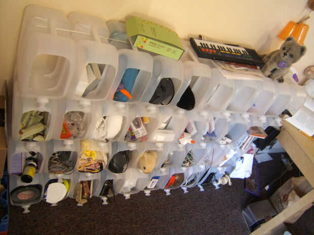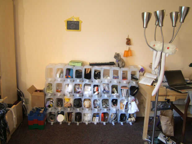 Básicamente se trata de beber mucha agua embotellada y usar las jarras el agua entró para almacenar cosas. Usando su método, no sólo obtengo un cubo resistente de plástico modular de $2, sino también regalamos 2 galones digno de agua potable. Muy abogo por un sistema de almacenamiento. Sobre todo si son invadidas por las piezas pequeñas.