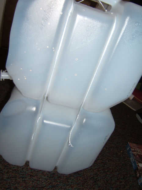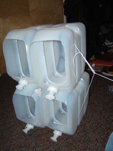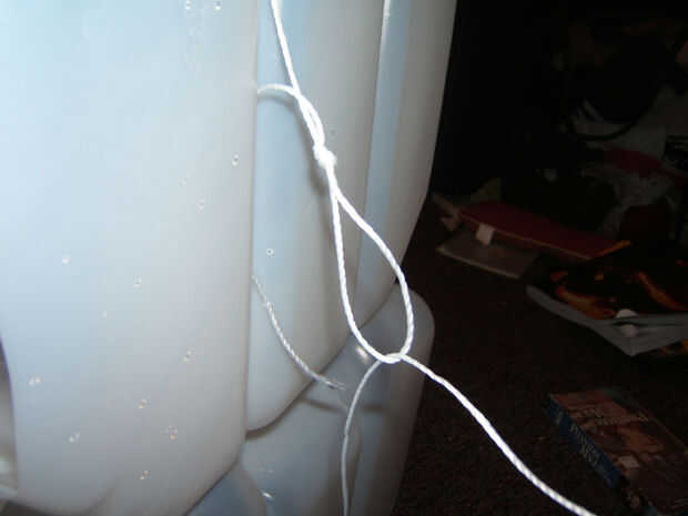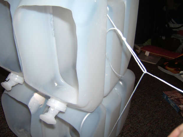 Afortunadamente, las jarras de 2 galones con dos ranuras que pueden utilizarse para atarlos juntos. Usé algunos básico cuerda blanca que me dieron en la ferretería.