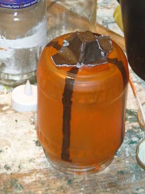 Conseguir un buen cepillo fino y pintar unas líneas abajo de la jarra para un poco más de una mirada calabaza mientras que pintar también el "tallo de pega caliente"