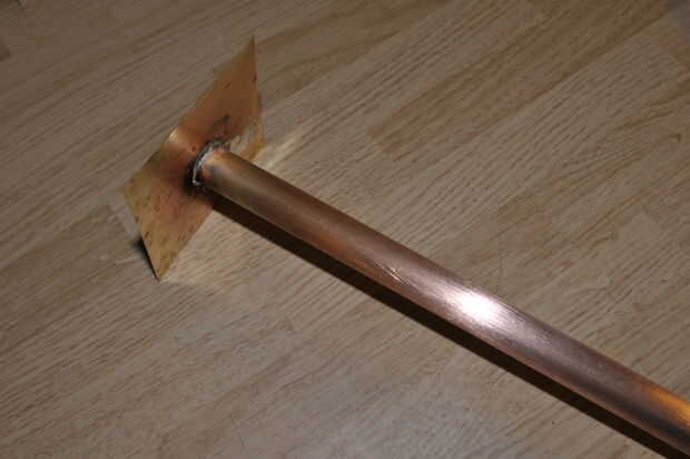 Quería una buena conexión con el poste central así que corte el tubo de modo que termina cerca de ocho pulgadas por encima del borde del cubo y soldar un pedazo de hoja de cobre 4" cuadrado en un extremo.