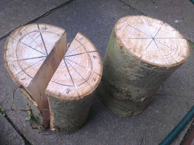También debe tener en cuenta la capacidad de la taza deseada. Tenía la intención de las tazas hacen que alrededor de 2 pintas, así que corte un par de registros de 23cm con una motosierra (el ángulo es más predecible que cuando usando un estándar de la sierra) que varió entre 11 y 13cm de espesor una vez de raspado. Dejando 1,5 cm para espesor de pared daría 9cm de diámetro interior promedio. Con una base de 3cm de la parte inferior de la taza, podría ser llenado con 18cm de líquido antes de ser "completo" (2cm de la parte superior), lo que la capacidad de la taza alrededor de 1150ml (aunque esto disminuirá debido a segmentos hueco incompletos y el proceso de sellado).