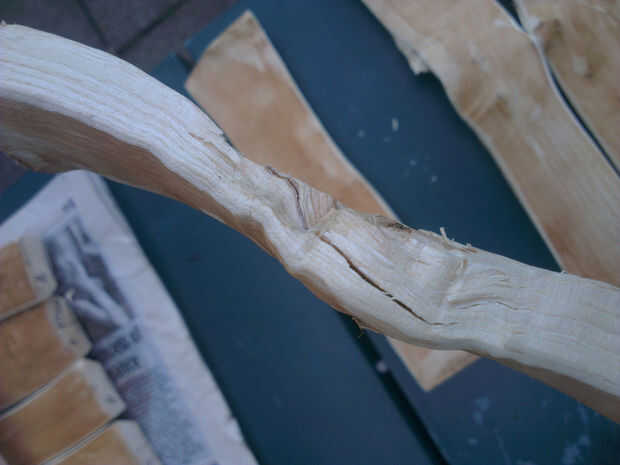 Ocasionalmente se puede encontrar un nudo en el centro de la pared, y el hacha puede virar bruscamente a un lado de él. Si comienza a ir hasta el borde exterior, detenga inmediatamente y en lugar de otro hack, en el exceso usando el hacha solo, con el objetivo del nudo (ver imagen 4). Puede reparar la grieta no deseada con pegamento para madera, ya que podrá sellarse después.