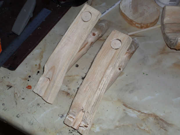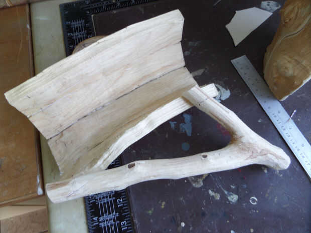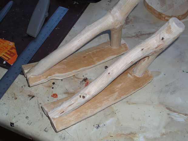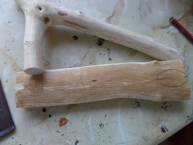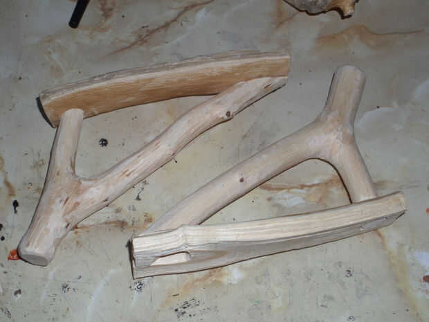 Para la manija, opté por una rama de avellano sobre una pulgada de espesor, con un ángulo interior de aproximadamente 50°. Mientras que hubo similares ramas en el árbol de la haya, fueron muy suaves una vez despojado de su corteza y no coincide con el resto de la taza. Cantos naturales de la rama de avellana parecían una cornamenta de los ciervos una vez ligeramente lijada.