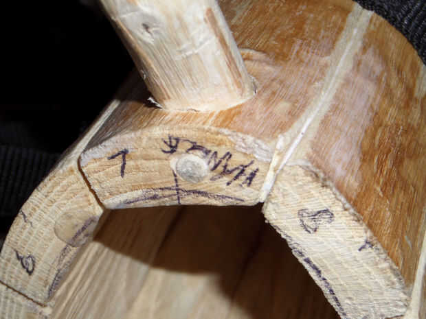 Para asegurar la parte superior, perforó un agujero de 4mm en de la parte superior, cerca de 40 m m profundo y martillado en una clavija de madera.