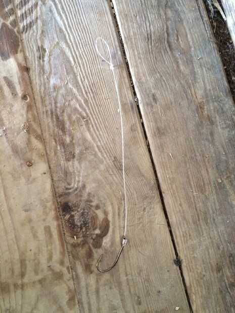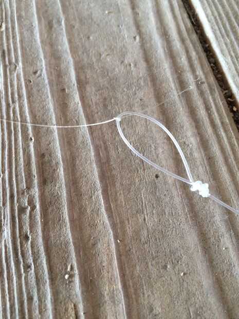 Coger el gancho y con el otro extremo del pie 4 pieza de línea de atar el gancho a él.