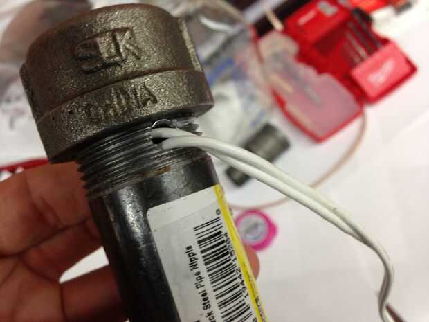 2. A continuación, necesitará taladrar un orificio en el 1 "x 4" tubería de hierro negro con la broca de 1/8". Perfore el orificio en el centro de la rosca en un extremo de la tubería de hierro negro.