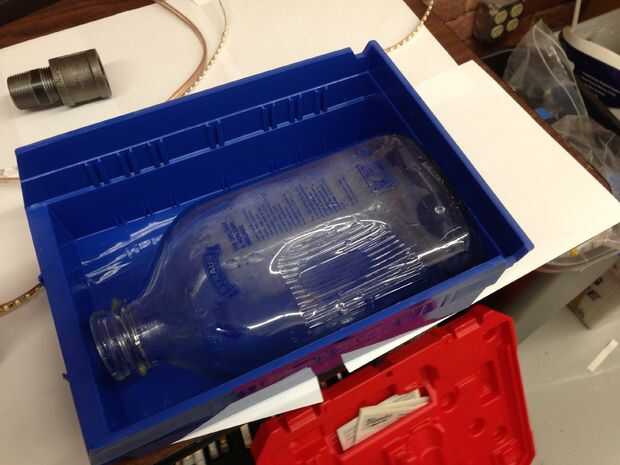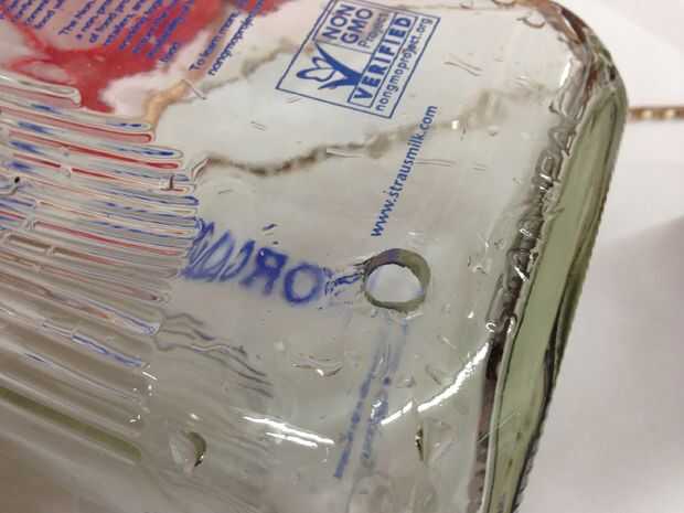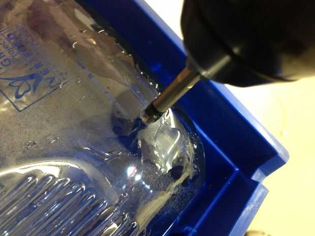 1. En primer lugar, usted necesitará taladrar un agujero con la broca cerámica en la parte trasera de la jarra de leche. Finalmente, el cable de la lámpara se alimente a través de este agujero. Necesitarás agua corriente (o un vaso grande de agua) y un recipiente para colocar la jarra en durante la perforación. Recuerde usar protección facial y ocular al perforar vidrio. El truco es hacer cuidadosamente un agujero con una presión firme al verter el agua sobre el cristal cada pocos segundos para enfriarlo. Esto evitará que el cristal se agriete.