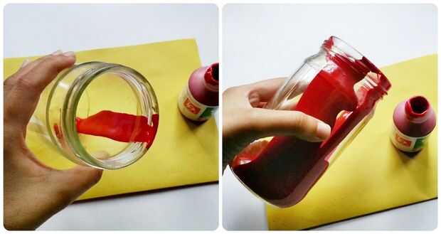Verter cierta cantidad de pintura negra en el frasco. Gire el frasco cuidadosamente para cubrir el interior con la pintura vertida.