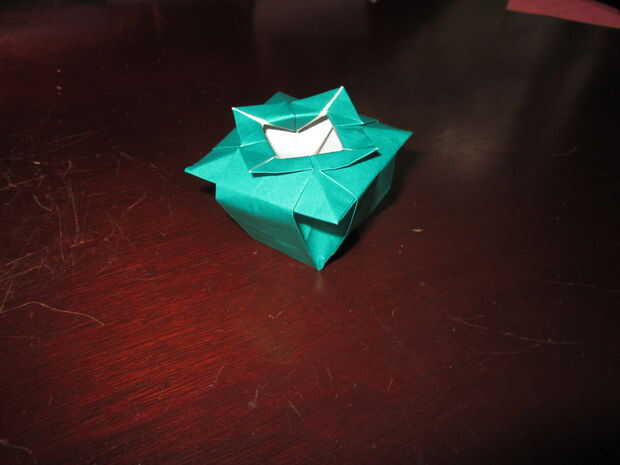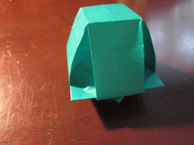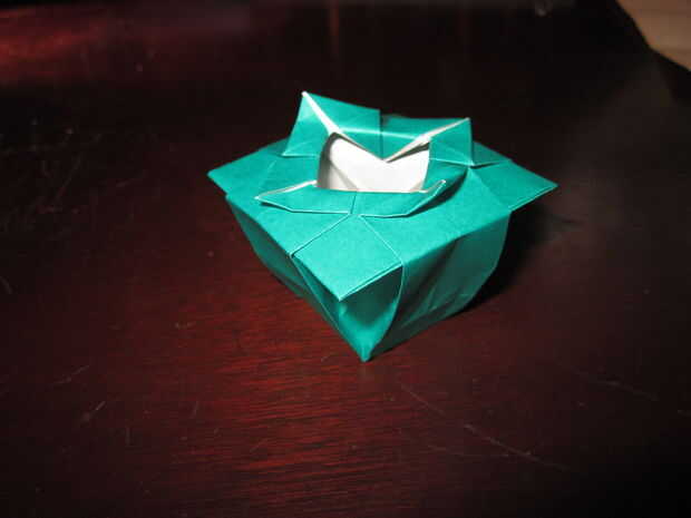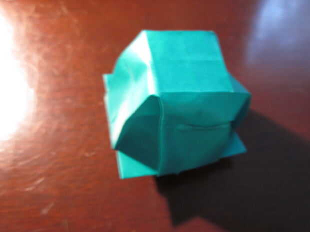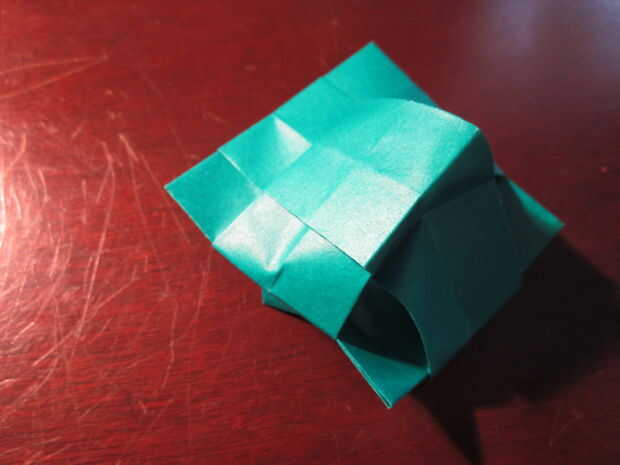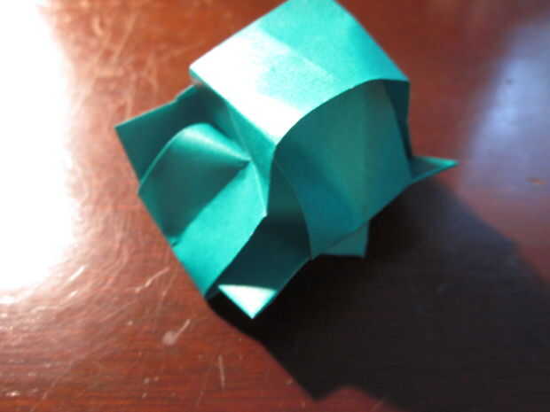 You're almost there! Pero este último paso es extraño. Su similar al agua origami globo/caja de la manera que tienes que inflarla. Necesita tirar de los lados de las plataformas levantadas hasta que la forma general se empieza a formar. Luego alisar hacia fuera los lados. Entonces ¡ Felicidades! Estamos listos.