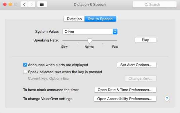 Ahora usted puede controlar el ordenador con construido en comandos de voz en tu mac, pero ¿qué más puede hacer? Realmente un poco buena. Este solía ser un poco más fácil en las versiones anteriores de os x, sin embargo, todavía puede personalizar comandos un poco. De hecho ahora existe una plantilla especial para comandos de voz incorporados en automator, conseguirá en automator más tarde aunque. Por ahora, primero tendrás alertas anunciadas con una frase personalizada haga clic en dictado, luego marca la casilla "anunciar cuando se muestran alertas". Desde allí, haga clic en establecer opciones de alerta y a continuación, seleccione o agregue una frase personalizada.