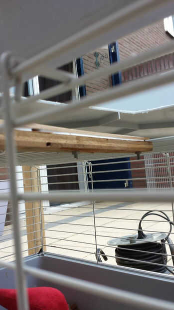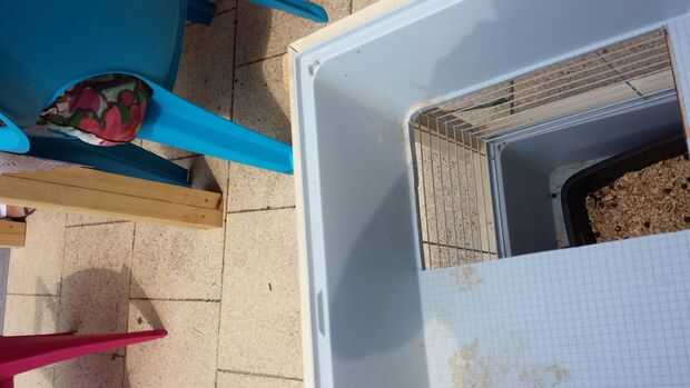 En este punto, es aconsejable cortar un agujero en la jaula superior de manera que el conejo puede saltar desde la parte inferior hasta la parte superior.