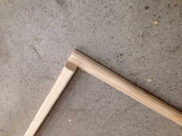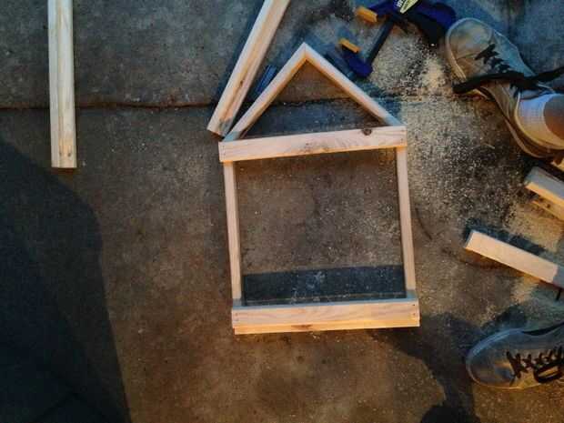 El siguiente paso es encolar y clavar los segmentos. Primero hice el pico superior. Luego añade los dos que van a él. Para asegurarse de que se trata de la anchura correcta aparte pongo el trozo en la parte inferior para mantenerlo en su lugar. Yo sólo había clavado los juntos.