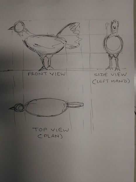 En mi escultura empecé parte central que es el principal cuerpo de gallina, comienzo de la fabricación con vista superior entonces vista frontal y lateral luego.