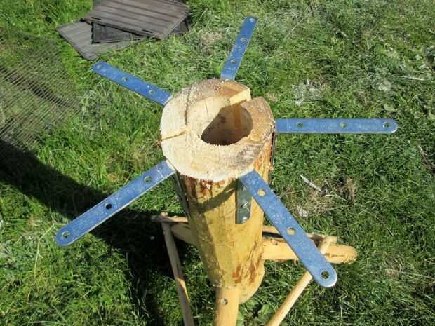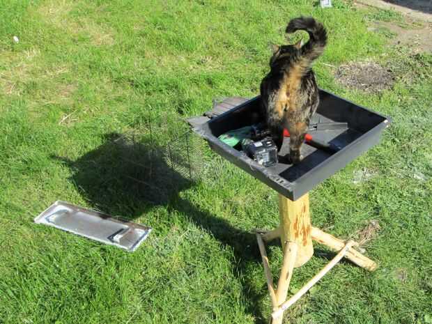 Atornillar la base de la gama para el trípode - utiliza unos ángulos de metal atornilladas en el trípode y clavado en la base - para tenerlo todo más estable. Habrá madera en ella, madera pesada. Y carne, la carne pesada. Y gatos, a veces. Que sea robusto.