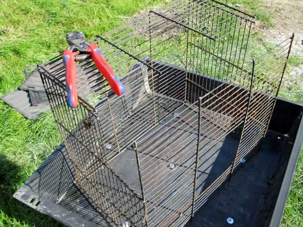 Coloque la jaula al revés - obvio, corte algunas cosas derecha e izquierda, capas un pedazo de la parte posterior posterior para formar la 'base elevado' y remache o tornillo de toda la base.