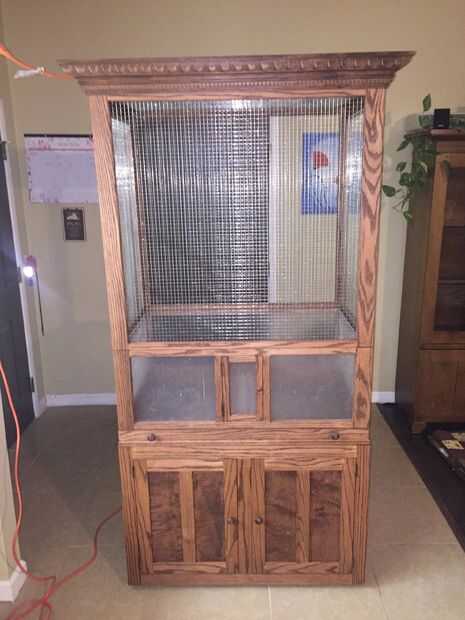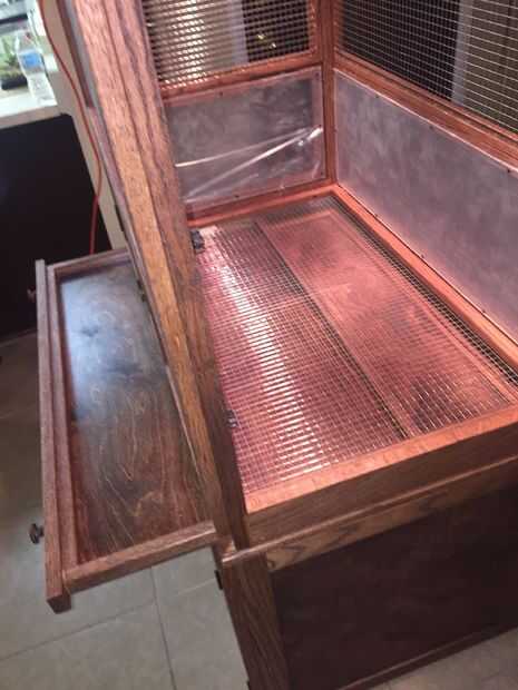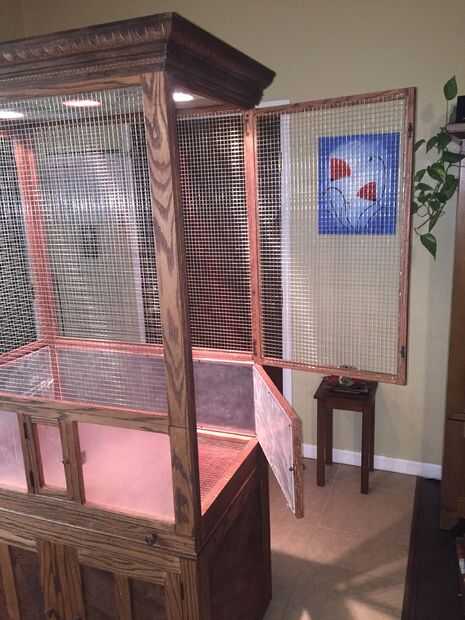Aquí es un hermoso roble pantalla con roble patas de Queen Ann, paneles de acrílico de 3/16", moldura, alimentadores agradable, iluminación UV y un aire de limpieza y sistema de filtración. La jaula mide 36 pulgadas de alto, 42 pulgadas de ancho y 24