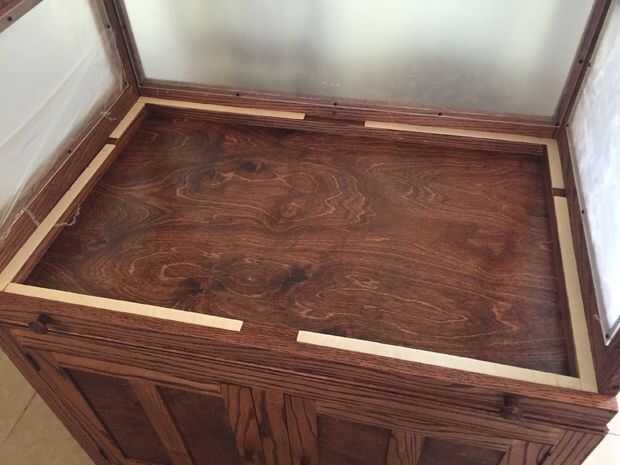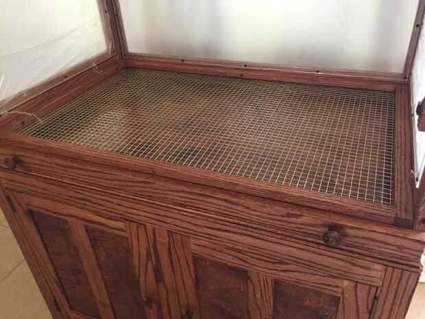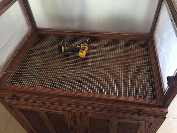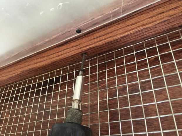 Coloque la corredera cajón en su lugar. Entonces utilice las franjas espaciadoras suministra y los ponen encima de los bordes del cajón como se muestra. Luego coloque la rejilla de pantalla encima de los. Tenga en cuenta el borde marcado "frente". Use tornillos de 1 5/8" a la espalda y los lados utilizando los orificios pre-taladrados. El último tornillo en frente entrará en Panel D en el siguiente paso.