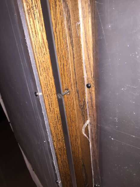 Use 12 5/8" tornillos para sujetar los paneles B y C a Panel A, pasando por el interior del marco de la puerta. Hay dos tornillos en cada panel, uno alrededor de una pulgada de la parte superior y de hasta la mitad. Agradable y apretado.