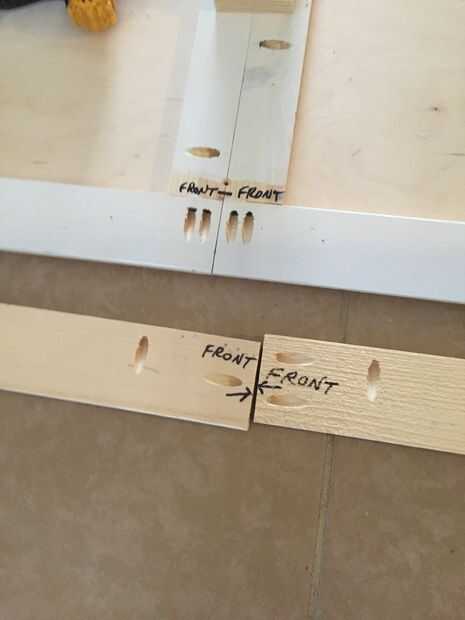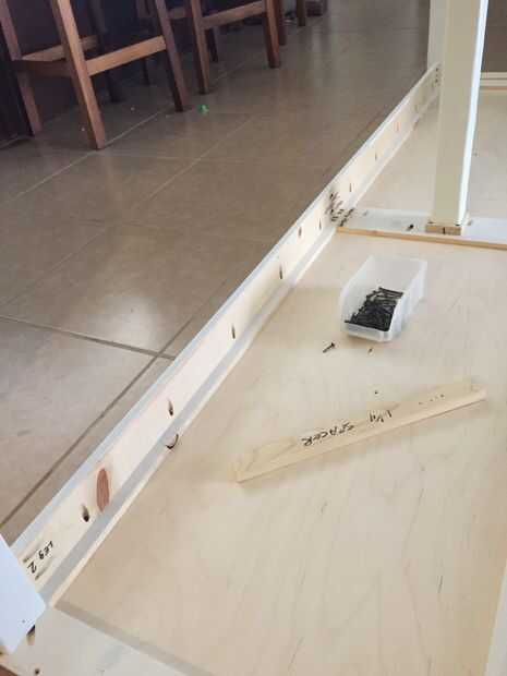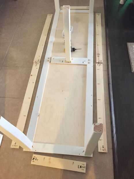 Entonces, encontrar las seis piezas de la base de apoyo. Hay cuatro piezas largas y dos cortas. Las piezas largas están marcadas parte delantera y trasera donde fije y las piezas laterales están marcadas que pierna conectarse. Coloque tres tornillos de 1 1/4" para poner las piezas delanteras y luego las piezas de la espalda. Establecer la paz entre las piernas de uno y dos. Utilizas la barra espaciador de 1 1/4" para alinear la barra de soporte. Fije a la base con tornillos de 1" y a las patas con tornillos 1 5/8". Luego coloque el resto de los soportes.