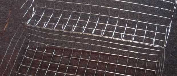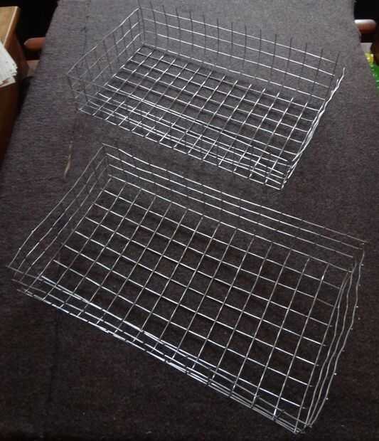 - Poner una cesta encima de la otra, luego doblar los alambres abiertos de una cesta alrededor del borde liso del otro, formando una bisagra como se muestra.