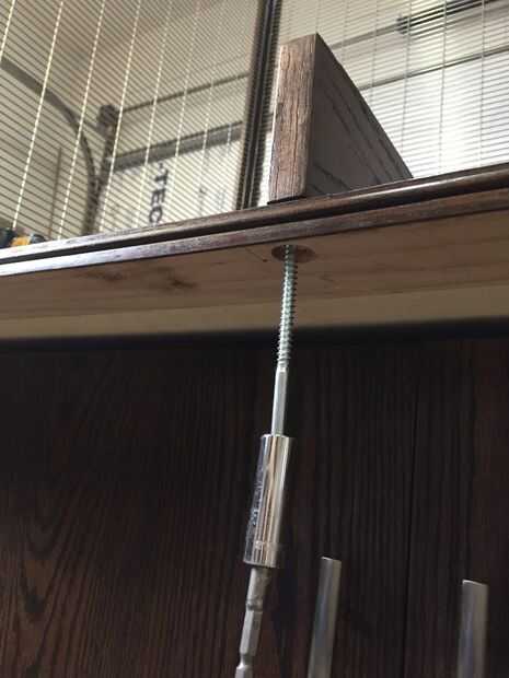 Hay dos tornillos que sujetan este apoyo en la parte inferior. En la parte posterior, utilice el tornillo de cubierta gris. Alinee el orificio de la parte inferior en el orificio posterior del soporte y apriete. Luego exponer la parte delantera de la parte inferior para instalar el perno de retraso largo que irá todo el camino a través del apoyo de divisor y en la parte inferior de los paneles de puerta. Así que por ahora, basta con ejecutar el perno en el soporte pero no pegado a través de.
