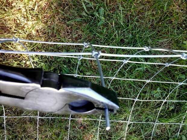 Con los alicates resistentes, agarre el cable en el último tercio de su longitud y dóblelo hacia abajo y alrededor tan que el gancho se enfrenta a la curva de la longitud de la jaula.