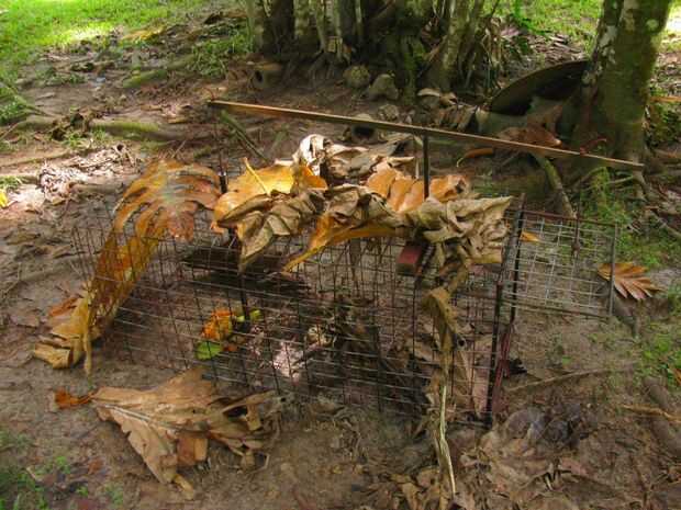 Es una trampa de la caja. Por lo tanto, atrapa los animales sin herirlos. Su diseño es similar a una pequeña madera que yo había construido allá que fue un gran éxito - hasta que se pudrieron. Puesto que la selva no tratar la madera muy bien, decidí probar mi mano en la soldadura y soldar con autógena juntos una trampa de larga duración. Es muy simple en su diseño y no es nada de lujo.