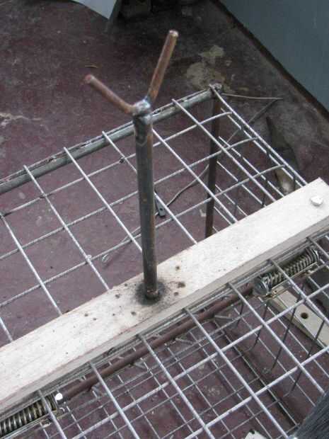 Soldó con autógena un pedazo de varilla al perno de la pieza de madera que sostiene la puerta en medio. Yo después soldado con autógena una "u" en la parte superior para dar un lugar para una pieza de madera en.