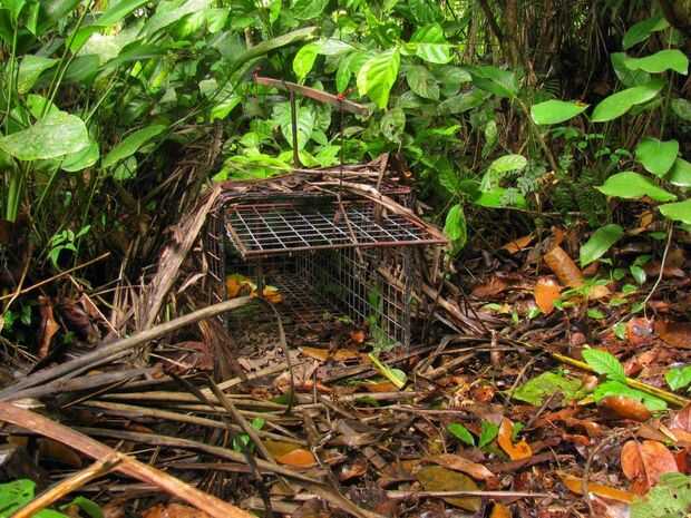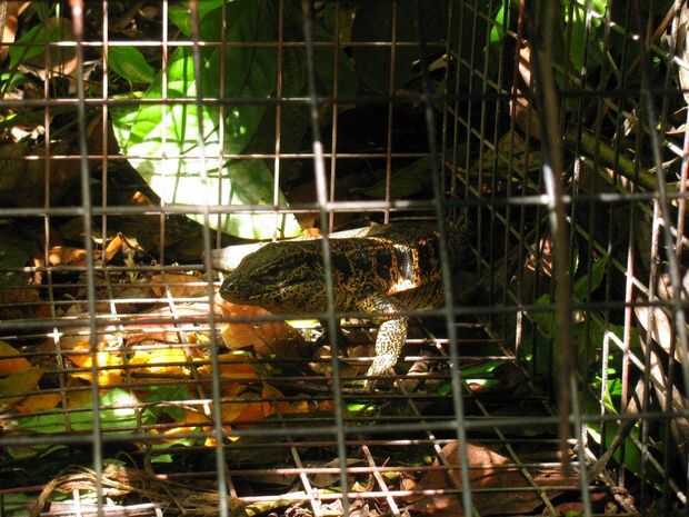 La segunda captura fue un poco más emocionante, pero ahora es una molestia. Era un Salapenta (nombre local) o un Tegu negro norte. Lo lanzó, pero debe han dicho a sus amigos. Algunos de los lagartos son lo suficientemente grandes como para activar la trampa, pero luego son lo suficientemente pequeños como para escapar a través de la malla. Esto hace que la trampa se encuentra cerrada pero sin nada en él que es molesta.