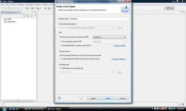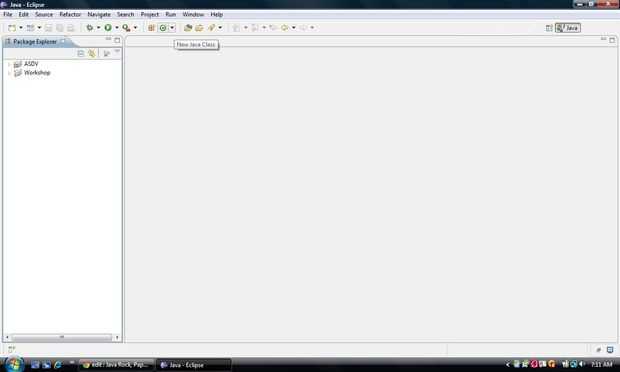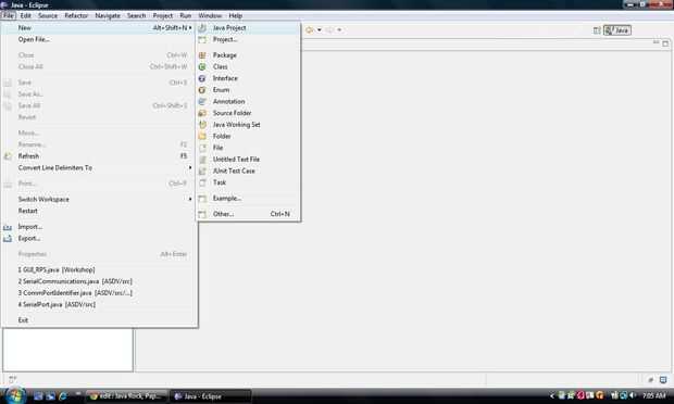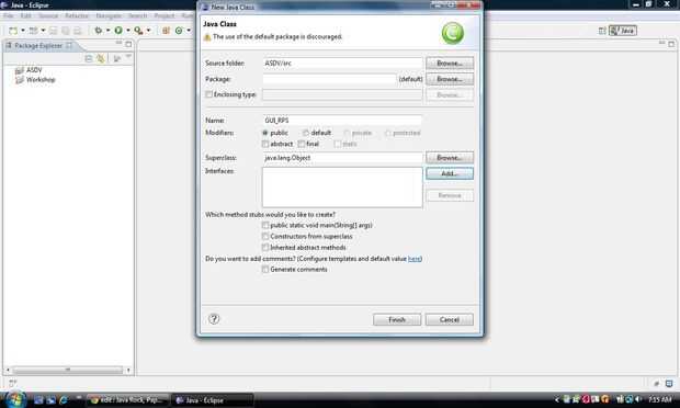 Después de descargar Eclipse, ir a símbolo del sistema, a continuación, Escriba mkdir trabajo. Eclipse Open y se le pedirá para abrir un espacio de trabajo, haga clic en Aceptar. Una vez que estés en Eclipse ir a archivo > Nuevo > proyecto Java. Una vez allí, el nombre lo que quieras, luego donde dice diseño de proyecto, haga clic en carpeta de proyecto de uso de fuentes y archivos de clase. Luego realizar una nueva clase y desmarque los métodos abstractos heredados, asígnele el nombre GUI_RPS. Eliminar todo lo que está en el programa.