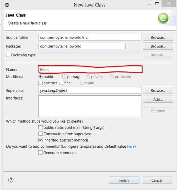 Ahora haga clic en el paquete una vez! Luego presione el botón de "clase". Le llevará al menú de nueva clase. Asegúrese de que el nombre "Principal".