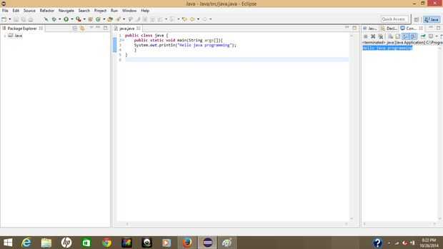 Impresionante, pero ahora para ejecutar el código, simplemente haga clic en el pequeño triángulo verde en la parte superior y dirá 'Programación en Java Hola' si esto te funcionó acaba de crear su primer programa en java. ES impresionante que espero que usted siga aprender java, así que usted puede estar en su manera de crear grandes juegos como Minecraft (y sí minecraft fue hecha con java).