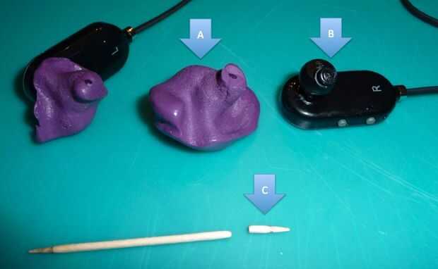 (C) muestra la punta del palillo, usa el "estilo cóctel". Empujó el palillo en el agujero del auricular (A) entonces cuánto guesstimated para cortar. La punta se utiliza para colocar el molde en el conducto auditivo, así como mantener la abertura libre de silicona.