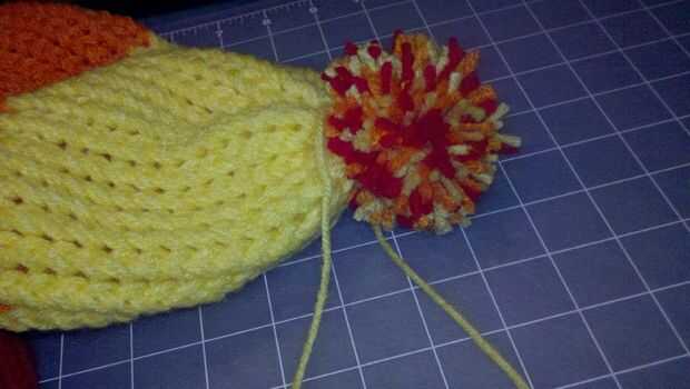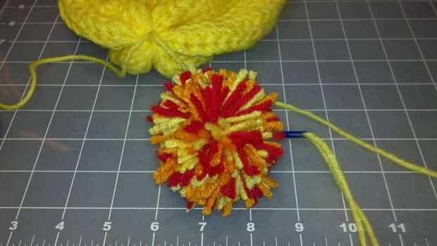 Pega la aguja a través de los pompones en el centro y empujar la pom pom en la parte superior del sombrero.