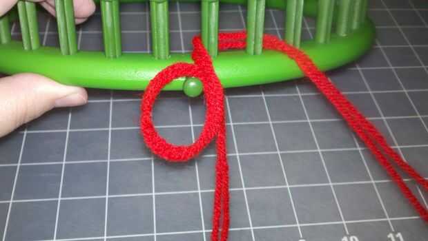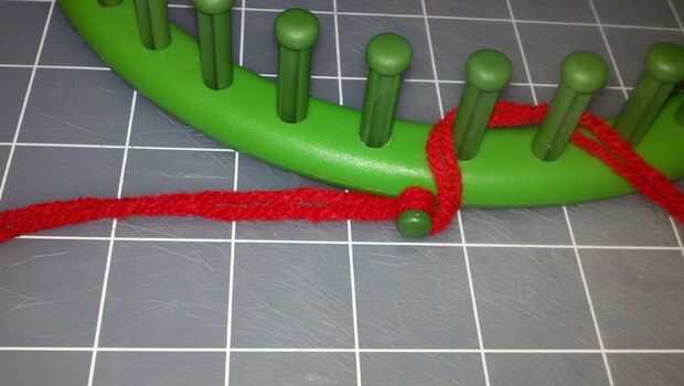 Envuelva el hilo alrededor de doce clavijas consecutivos, moviéndose hacia la derecha. Cruza el hilo sobre sí mismo en el interior del telar.