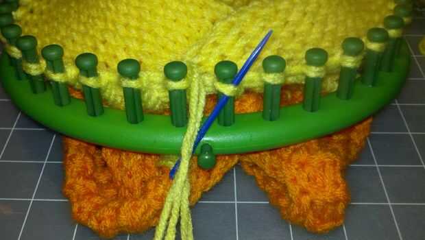 Tire los lazos en el telar y tire del hilo firmemente, cierre la parte superior del sombrero como un saquito.