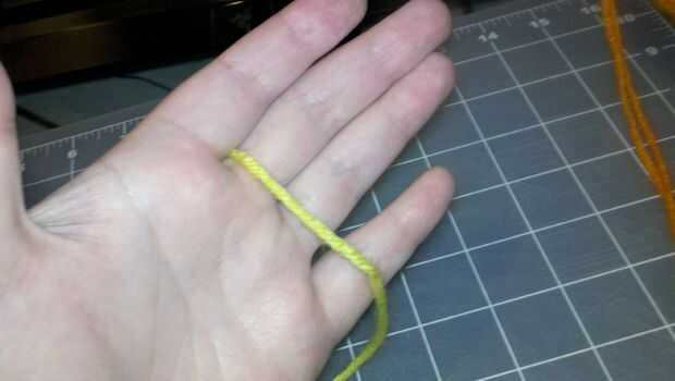 Tire el primer filamento de hilo alrededor de la parte posterior de la mano y atar firmemente a sí mismo alrededor del taco de lana.