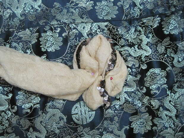 Doblar el material junto con el cordón para formar un patrón de los pétalos. Use alfileres para sostener el material. Gire el material para formar pétalos más (como se muestra) a lo largo del centro.