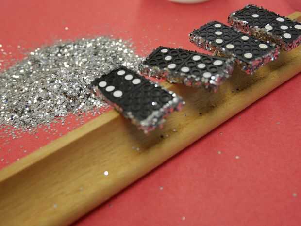 Coloca en el borde plano de un scrabble tile rack para secar. Es necesario equilibrarlos para que el pegamento mojado y el brillo no se pegan a la mesa.