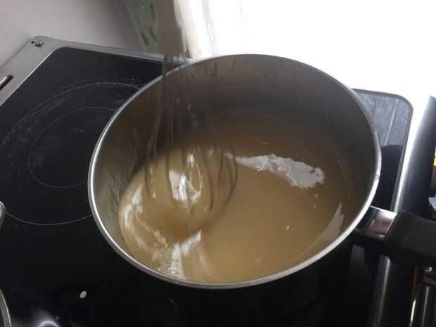 ALS dit volledig gemengd es, mag de kookpot op een middelmatig vuurtje en moet de dikkere substantie volledig vloeibaar worden. DIT kan duren incluso. Roer tijdens het wachten voldoende zodat de suiker zeker niet plakt aan de bodem.