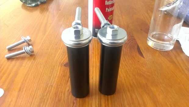 Para correctamente ajuste en seco y montar las estriberas, parece ser mucho más fácil de apretar con los dedos todo junto y luego ir a herramientas más adelante. En primer lugar, poner una de las tuercas en cada uno de los pernos de ojo, hasta el cuello. Para montar las clavijas en los pernos, pernos de diapositiva uno de la 2" en"lo hueco"de la clavija. Entonces el hilo en una de las arandelas de defensa, seguidas por el ojo de la armella y luego una segunda arandela guardabarros. Dedo apriete la tuerca hacia abajo para evitar todo lo que caiga. Ver la segunda imagen para entender cómo se encuentra el perno de ojo.