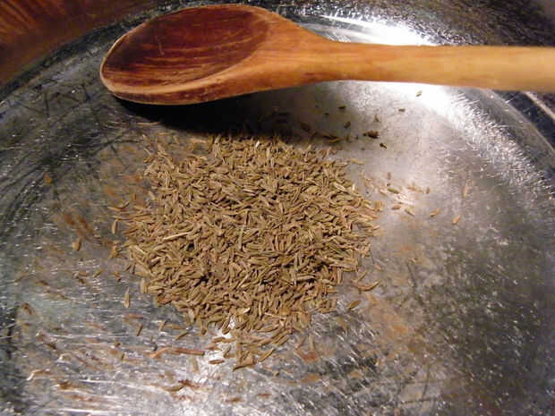 Seco-freír 1 cucharada de semillas de comino durante 5 minutos, revolviendo con frecuencia. Retirar del fuego y reservar