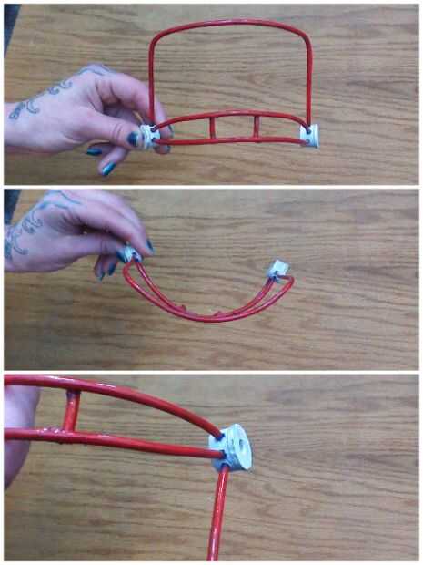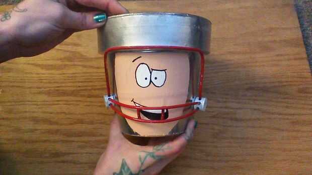 Para el protector de cara yo corte mi pequeño carrete de madera por la mitad y perforaron tres agujeros en el lado de ambas piezas. Corte y doblado mi cable para asemejarse a una máscara. A continuación, pegar los extremos del cable en los orificios de mis mitades de carrete y había pintado el cable. Cuando la máscara esté lista, los carretes de epoxy a la cara de su jefe de planta.