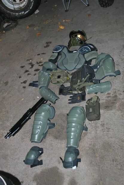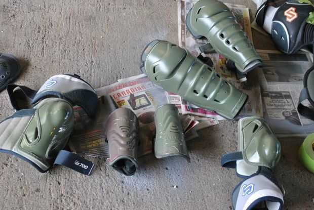 Como se puede ver en las fotos, empecé con el equipo de deportes, maltratados el revestimiento de cada pieza para que la pintura en aerosol palo y estancia, a continuación, cada pieza tiene unas capas finas de la pintura verde musgo, una advertencia de la tela en el equipo de hockey no sólo absorbe la pintura sino siempre secarse usé un palillo del pegamento para hacer una superficie para la pintura para adherirse a. Aproveché las franjas reflectantes en la ropa deportiva no sólo mantener el dimesion y ayudar con un poco de seguridad/visabitiy para la noche de Halloween.