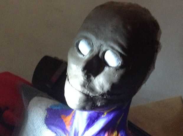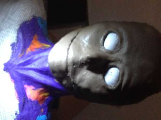 Yo pensaba que sólo tal vez fue un adolescente así que poner las cejas en el lado más suave. No sé por qué lo hice. Y la nariz no está demasiado bien definida porque, bueno, se supone que ser quemados. Los ojos son estallido porque él quemó los párpados y en cuanto a la boca, esculpió la boca con muy poca definición y yo sólo corría por los lados con uno de mis espátulas para el corte. Luego cubrí todo en arcilla, ya que el látex se adhieren al plástico y que sería estropear las cosas. heeeheee.
