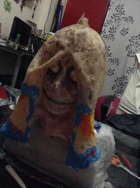 Oh, mi esposo decidió cortar los ojos y la boca y él hicieron los dientes de cartón y usaron como una máscara dentro de la máscara de látex. cuando él abre la boca, boca de la máscara se abre demasiado y parece que Jeff está sonriendo.